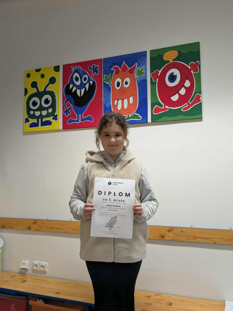 KROUŽEK MALÍŘSKÝ ATELIÉR: V soutěži, kterou organizovalo Planetárium Ostrava se na krásném 3. místě, v kategorii pro I. Stupeň ZŠ, umístila Anette Tomková se svou "Planetou nekonečných barev".